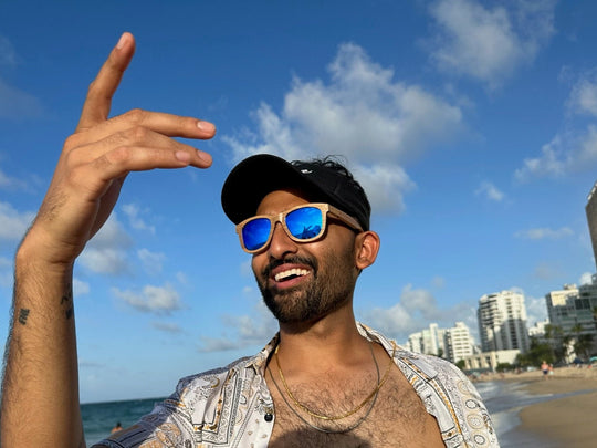 guy wearing blue hat and aviator sunglasses looking at taj mahal and girl wearing rainbow wood sunglasses on the beach